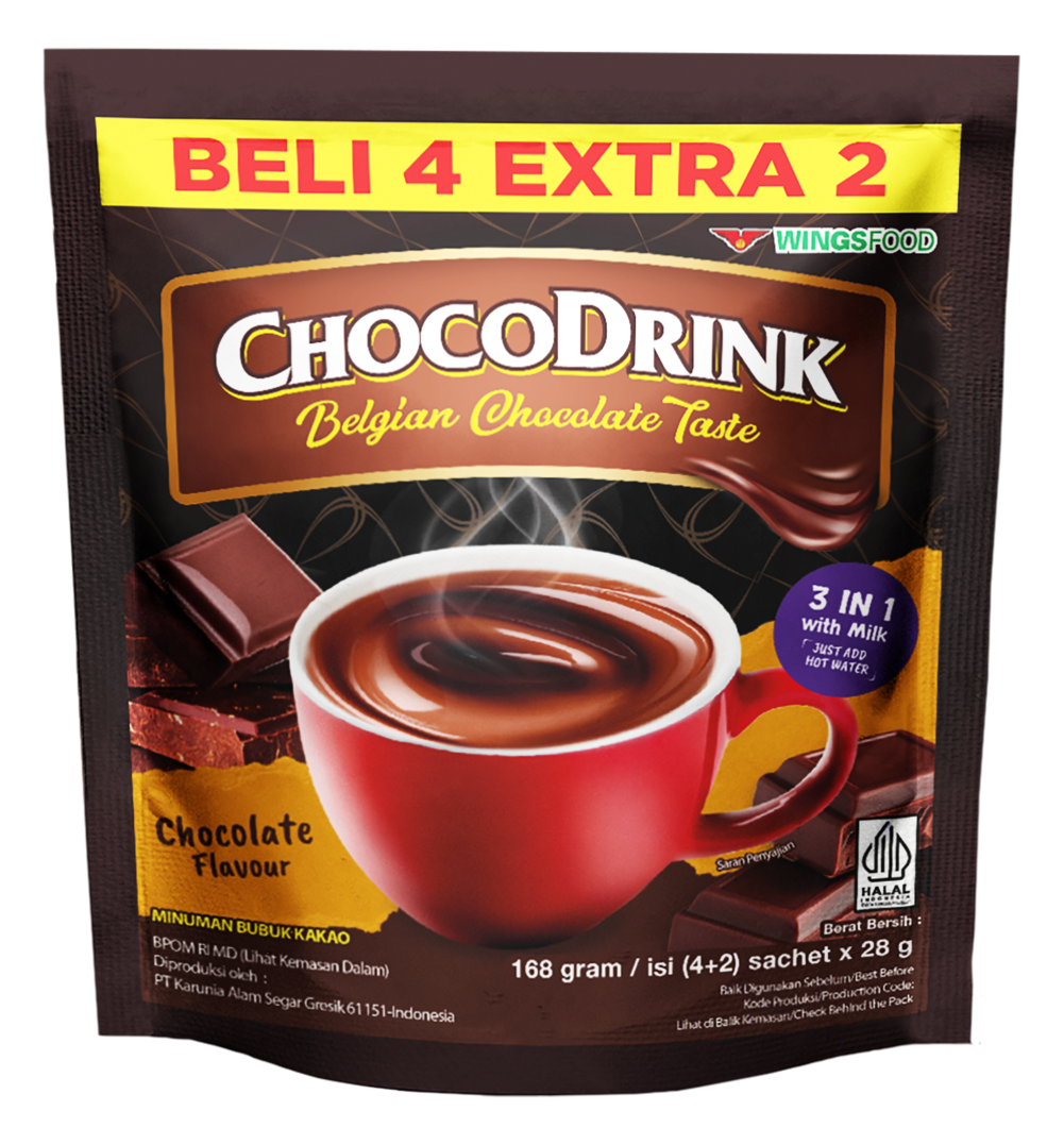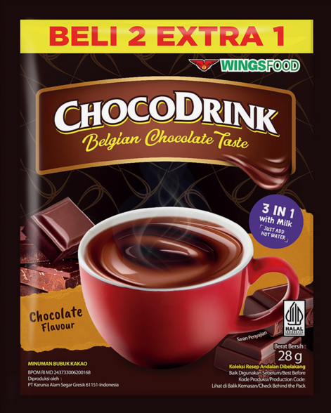 ChocoDrink adalah minuman coklat instan 3 in 1 yang memanjakan lidah dan meleleh dimulut dengan citarasa coklat Belgia. ChocoDrink diolah dengan perpaduan Coklat, Gula dan Krimer yang pas serta ditambah lembutnya Susu.